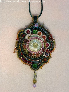 Jako centralny element projektu, zgodnie z moją rozpiską, znalazł się szklany guzik. Otoczyłam go taśmą cyrkoniową - mój debiut z tym miłym drobiazgiem. Wisior wykonałam techniką haftu sutaszowego, z dodatkiem mnóstwa koralików: TOHO, Fire Polish, Flowers, Bells, Magatama, Long Magatama, załapał się też jeden koralik Cathedral. :) Spód podszyłam zielonym filcem, krawatkę zszyłam ze sznurka gorsetowego, obrębionego TOHO.